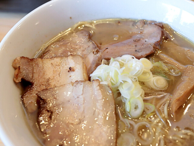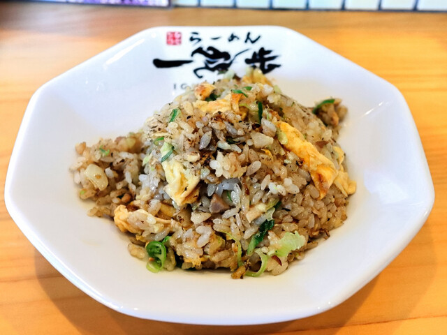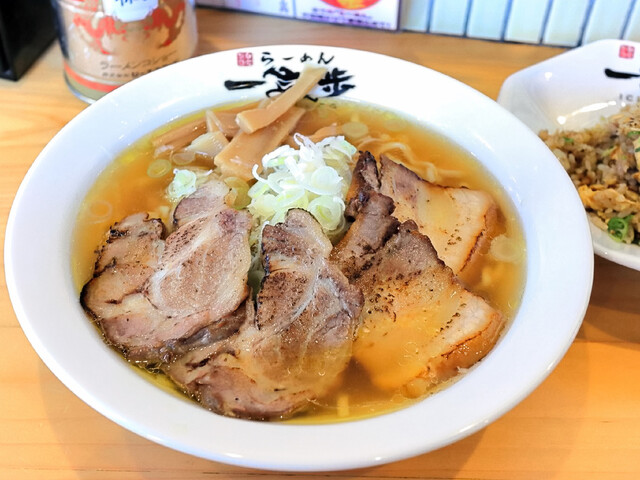 当初は豚骨系のラーメンを食べるつもりでしたが、メニュー見て鶏ガラ系もいいかなと思い、鶏ガラ醤油チャーシューを選びました。スープは清湯スープで、麺が見える透明さでした。コクを感じる味が美味しいと思いました。麺は平打ち麺で、スープが美味しく絡んでいました。盛りは、チャーシュー、メンマ、長ねぎで、今回も一完歩のチャーシューは満足させてくれました。半チャーハンも美味しいと思いましたが、若干焦げがあり、その風味が本来の美味しさを邪魔しているようでした。