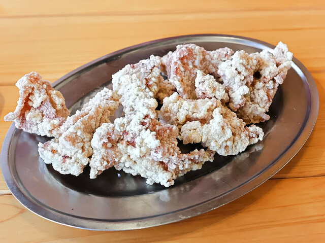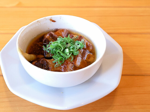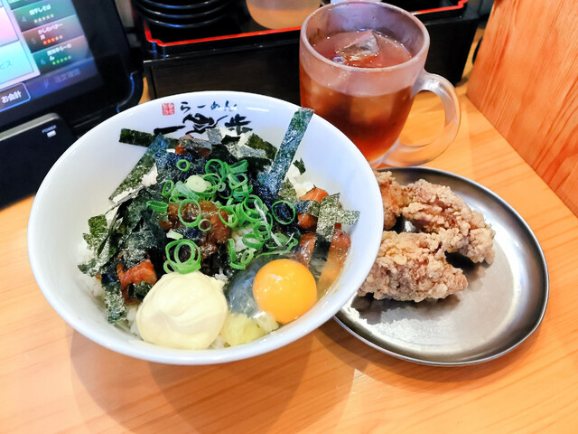 柔らかく仕上げられた豚角煮がご飯の上に盛り付けられ、刻み海苔と青のりが振りかけられていました。トッピングありは生卵とマヨネーズです。生卵を横目に三分の一ほどを食べて、空きスペースをつくり、そこで生卵を溶きました。溶いた生卵を豚角煮&ご飯に馴染ませていただくと、更に美味しさが増しました。鳥唐揚げも美味しかったです。丼にあるマヨネーズと溶いた生卵に絡めていただきました。鳥スープは、かきこみ過ぎたご飯を流し込むのに活用しました。