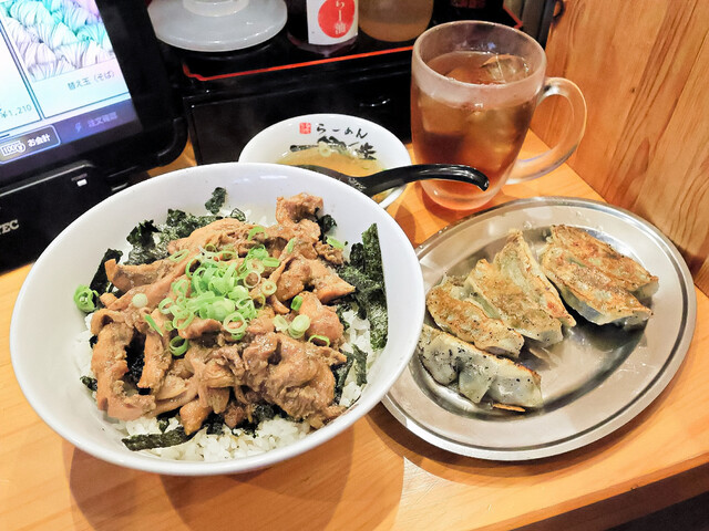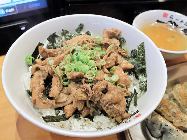 豚角煮丼トッピングあり、鳥唐揚げ、鳥スープをいただきました。