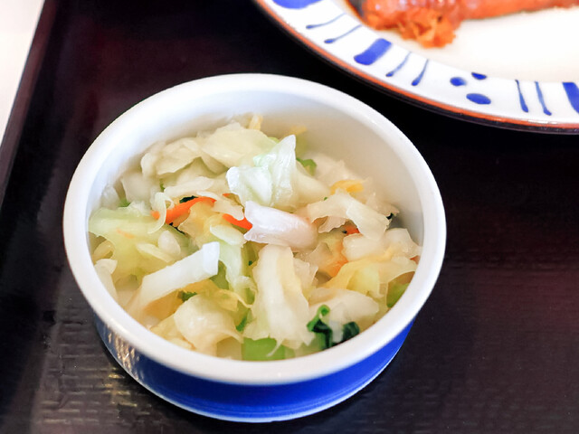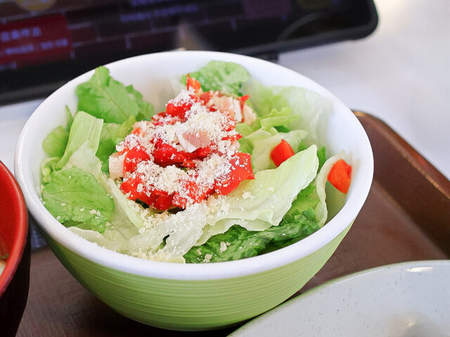 炭火やきとり丼並盛+シーザーサラダセット、牛カルビ皿並盛をいただきました。炭火やきとり丼という丼名に惹かれて注文しましたが、想像していたものとは異なりました。以前に同じような経験があったことを想い出して食の備忘録を確認すると、2015年9月に高松中央IC店で同様の料理を食べて後悔していたことがありました。焼いた香ばしさはなく柔らかい鶏肉で、まるで缶詰のやきとりを食べているような印象でした。缶詰のやきとりは好きですが、それをご飯にのせて食べようとは思わないので期待外れでした。しかし牛カルビ皿があります。それを活用してご飯をいただきました。シーザーサラダセットはシーザーサラダと味噌汁でした。サラダにはトマトとチーズが盛られていましたがドレッシングがかかっていなく、仕方ないので卓上にあるフレンチドレッシングをかけていただきました。お揚げとわかめが具の味噌汁は普通に美味しかったです。