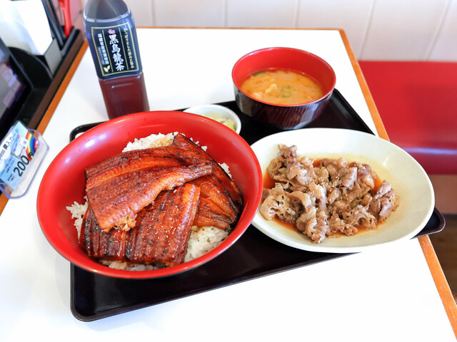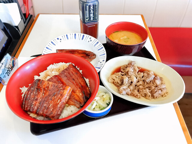 時節柄うなぎを食べようと思い、帰り道にあるすき家を選びました。うなぎを食べるのであれば1尾以上は食べたいと思い、うな皿を追加しました。デフォ盛りのうなぎに、うな皿のうなぎを加えることで、1尾以上の量になったと思います。程好く柔らかいうなぎで、甘めなたれとの相性も良く、ご飯がすすみました。中盤から牛カルビを投入してうなカルビにしていただきました。うなぎのたれと牛カルビの相性もよく、美味しくいただけました。とん汁は野菜の味が美味しく、おしんこは箸休めになりました。