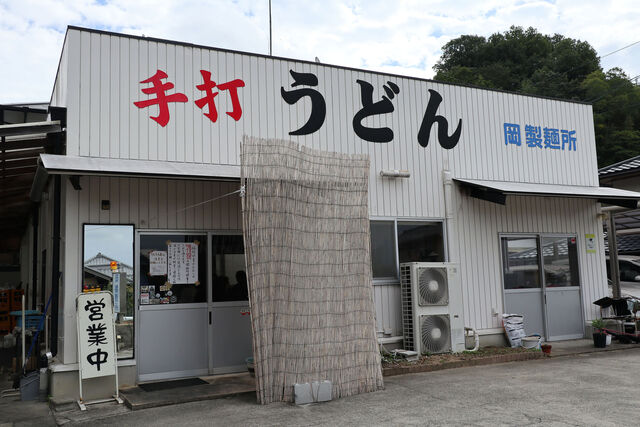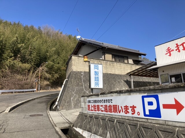 綾川町山田の山あいにひっそり佇む岡製麺所で駐車場完備ながら、昼時ともなれば賑わい必至。