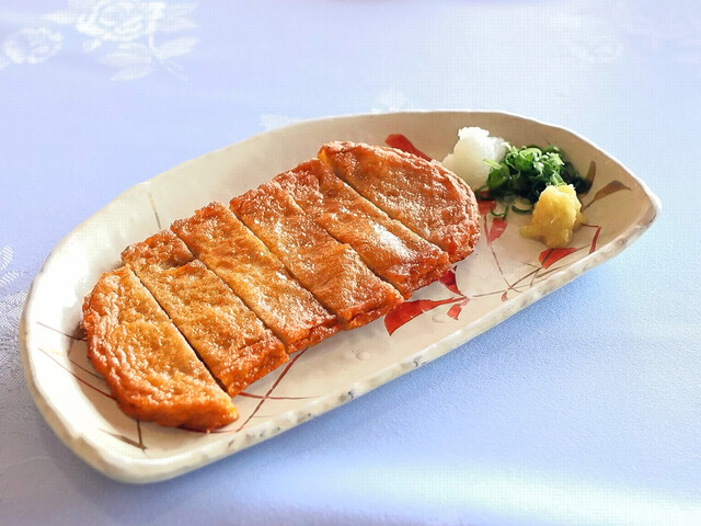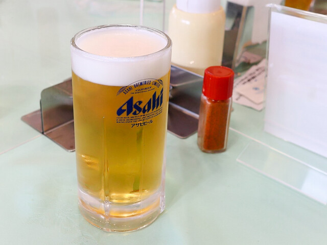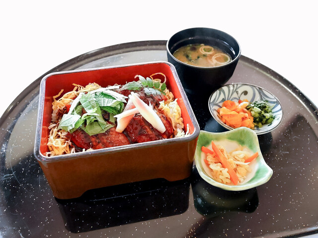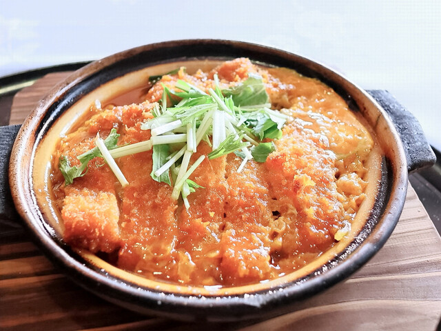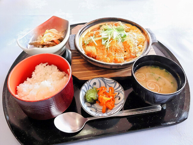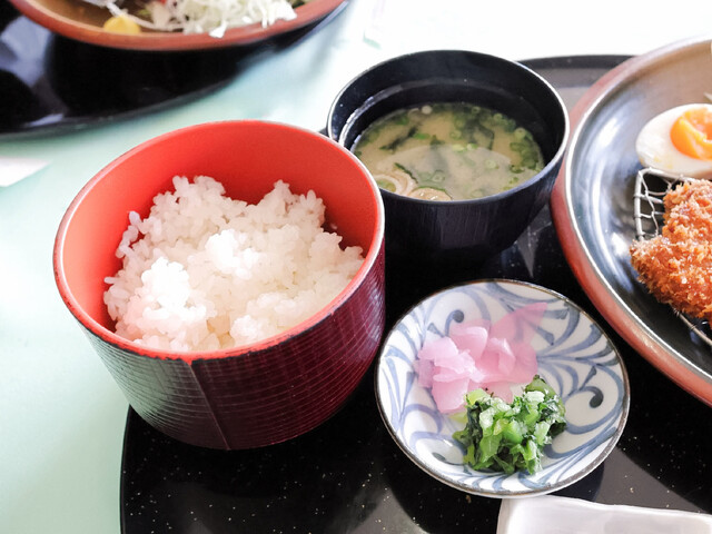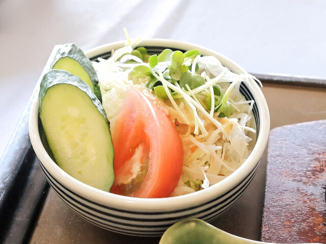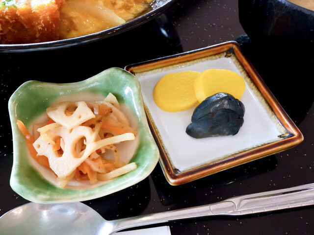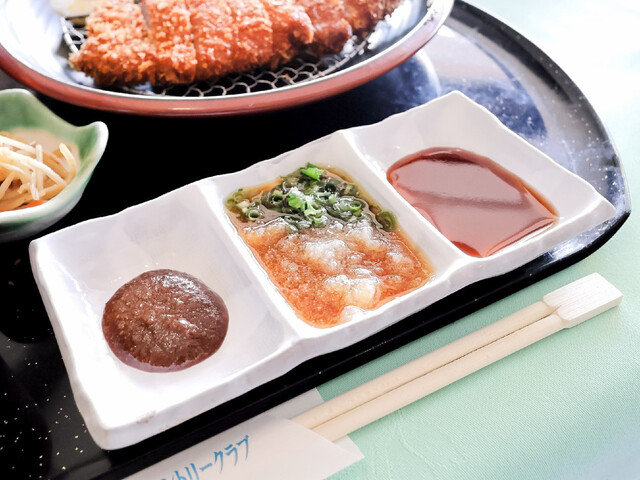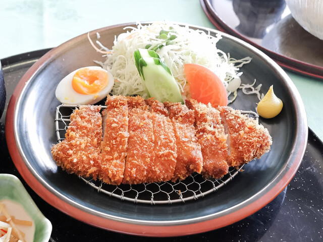 とんかつ定食をいただきました。暑さのせいでやや食欲は落ちていましたが、とんかつと生ビールの組み合わせに惹かれました。タレは3種類あり、それぞれ異なる風味を楽しみながらいただきました。とんかつはロースカツで、程好い厚さでフライ衣は硬めでざくッとした食感が特徴的でした。少し歯ごたえがあり、その食感が3種類のタレと生ビールに合っているように感じました。添え野菜はキャベスラ、トマト、きゅうりで、ゆで卵もありました。ご飯は食べず、味噌汁は少しだけ飲みました。小鉢の切り干し大根と漬物も、生ビールのつまみとしていただきました。