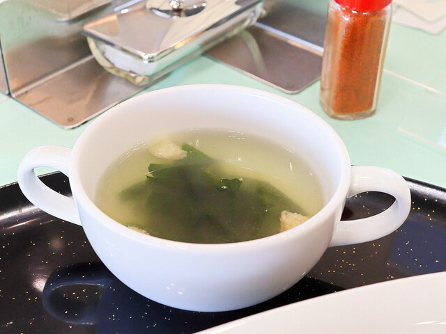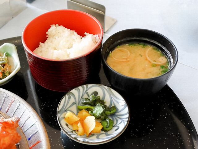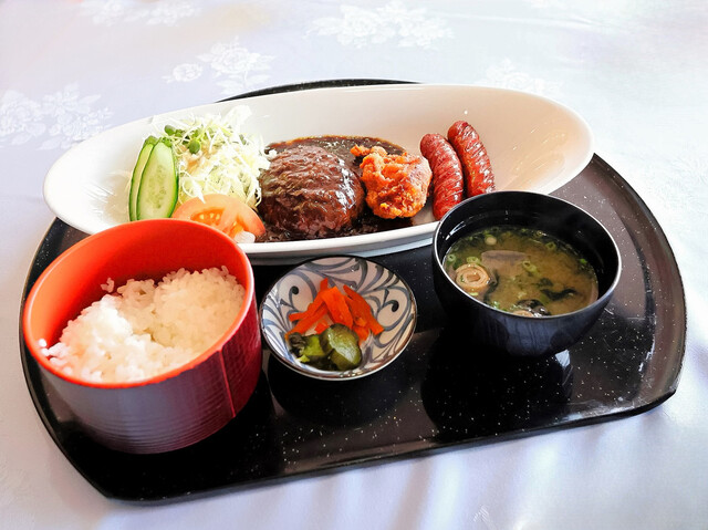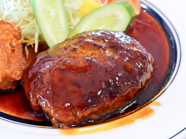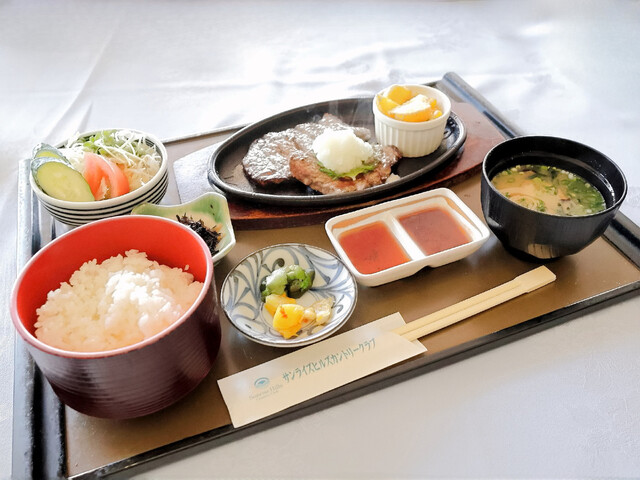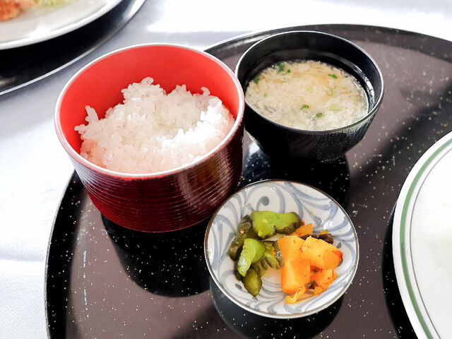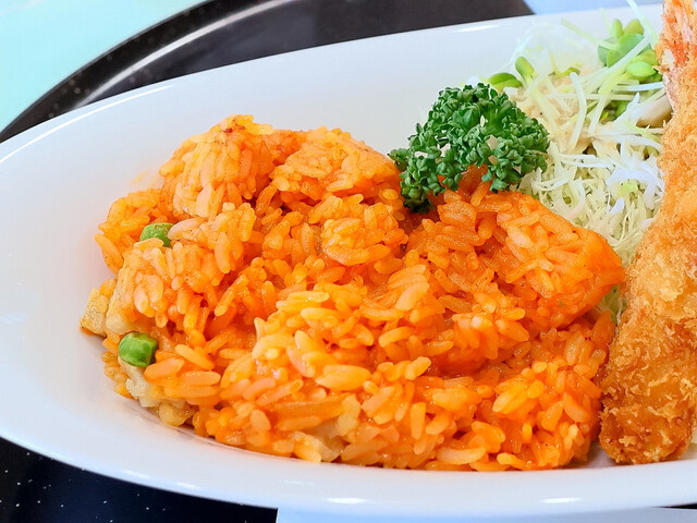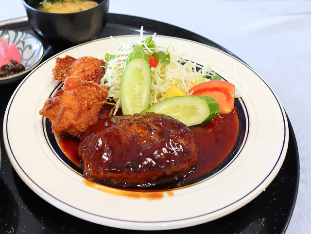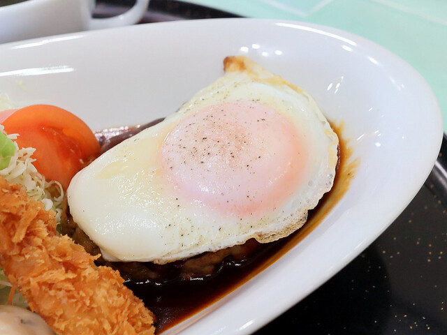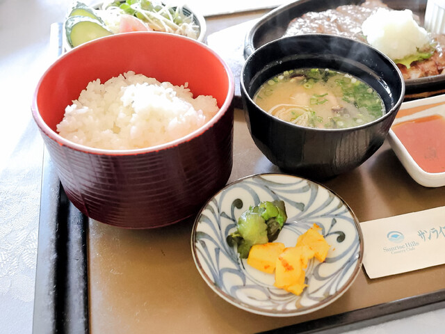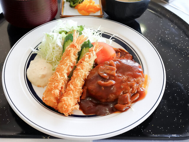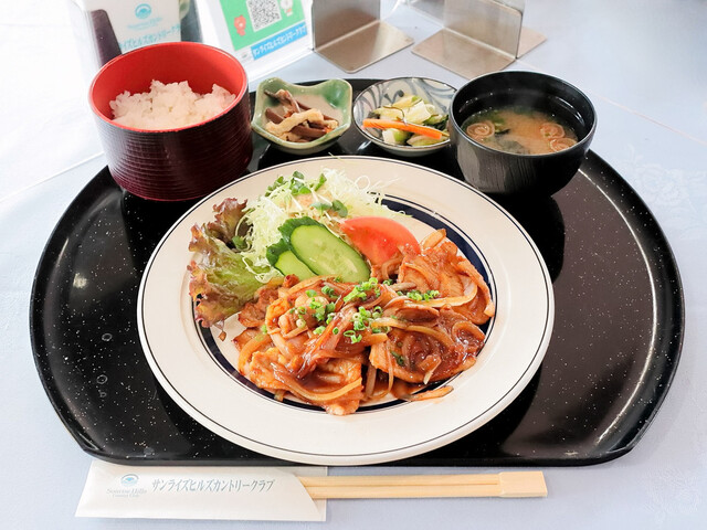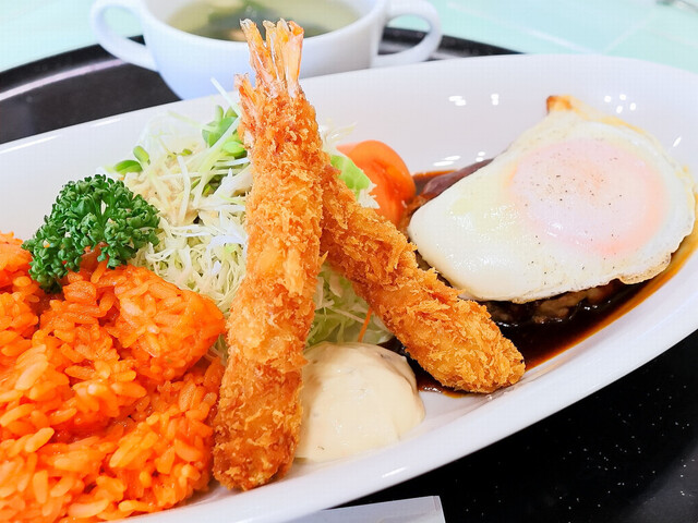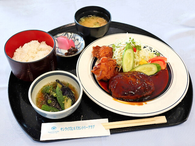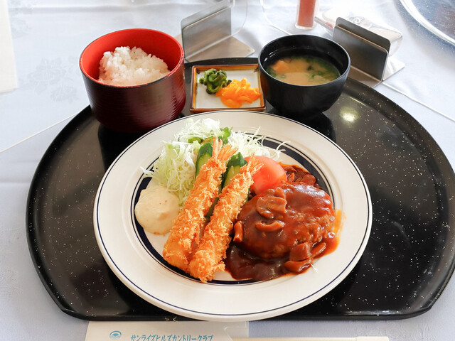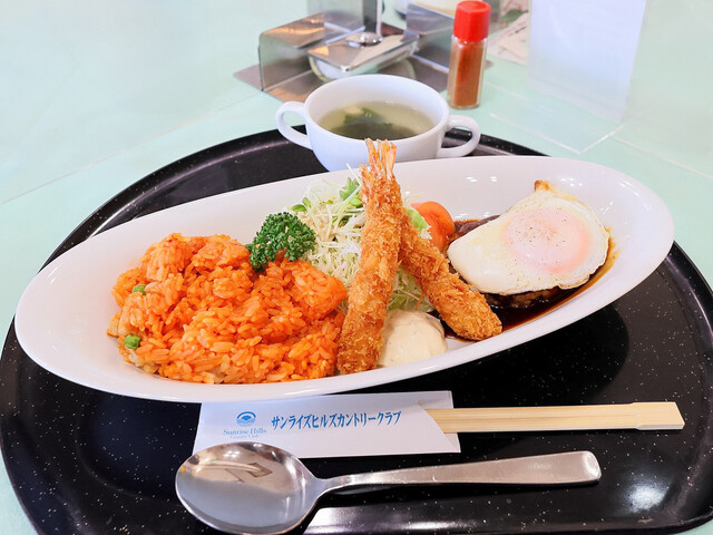 ハンバーグ&エビフライプレートをいただきました。私は洋食が好きで、メニューの料理画像を見て、ハンバーグとエビフライで洋食と思い選びました。料理の内容は、ハンバーグ、エビフライ、たぶんチキンライス、サラダ、スープで、ハンバーグには目玉焼きが添えられていました。ハンバーグの食感で出来合いのものだと思いました。ソースは普通に美味しい味でした。エビフライは冷凍食品のようで、チキンライスは、どうしたのかと思うほどべちゃっとしていました。私はゴルフランチでご飯を控えるようにしているので、食べないことに問題はありませんでしたが、同じ料理を注文した友人が、べっちゃん状態のチキンライスに嘆いていました。サンライズヒルズCCにあるレストランの料理は美味しい部類に入ると思いますが、今回は少し残念に思いました。