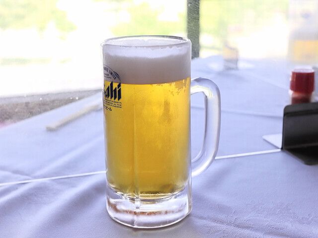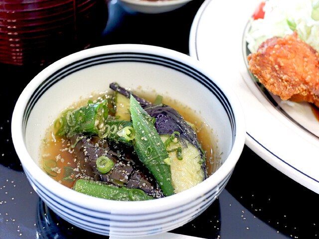 相方はゴルフでゴルフランチも楽しみにしていますが、残念ながら限定SELF DAY MENUで5種類しか選択肢がありませんでした。相方も私も5種の選択肢で4種に魅力を感じなく、残る1種の本日のおすすめ定食の内容を訊いて二人ともそれにしました。本日のおすすめ定食はハンバーグ&鶏の唐揚げでした。相方は特に何も言わず食べていました。選択肢が限られていたので残念だったのだと思います。私はハンバーグも鶏の唐揚げも好きなので、それなりに満足できました。ハンバーグは好きな味のソースで、鶏の唐揚げは揚げ加減がやや硬めでした。いずれも生ビールの肴にまりました。それ以上に肴になったのが小鉢のなすとオクラで、揚げびたしになるのかとても美味しかったです。