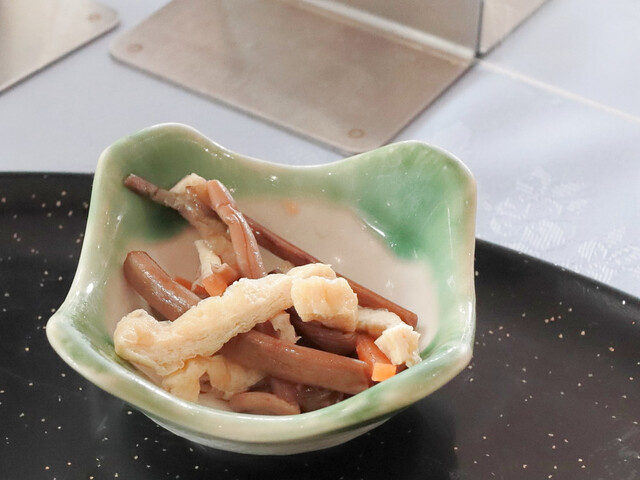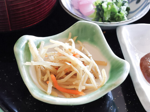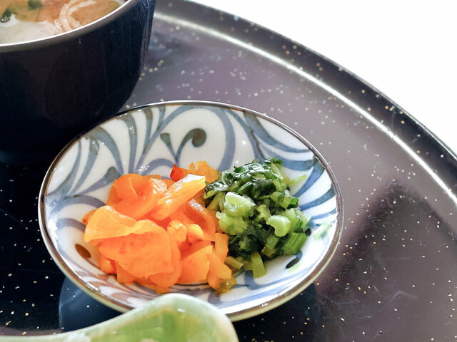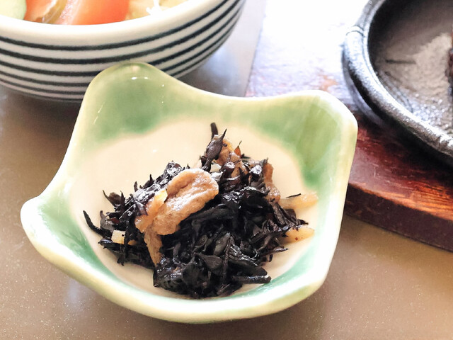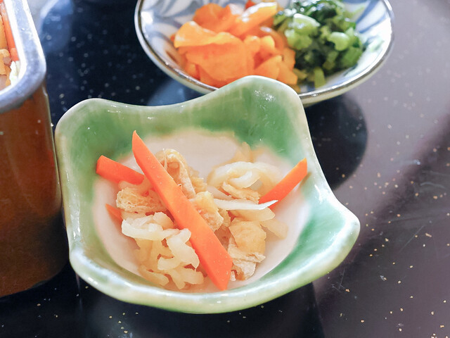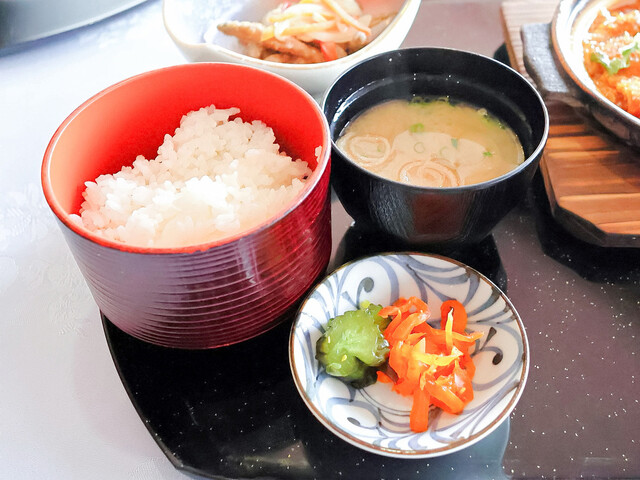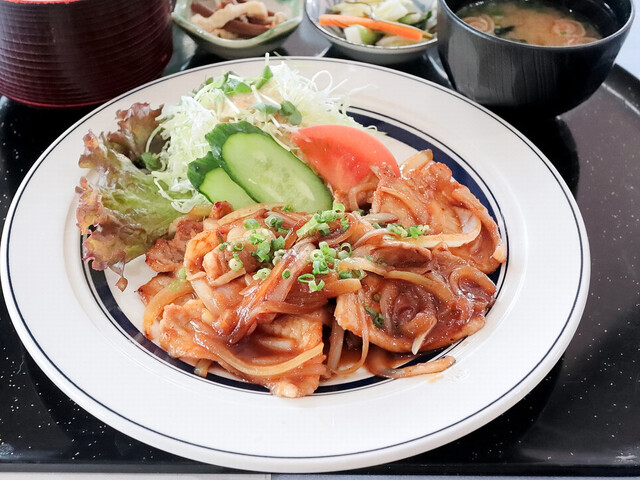 好きなタイプの生姜焼きで、味が良く、玉スラ多めで美味しかったです。豚ロースは硬くもなく柔らかくもなく丁度良い食感でした。添え野菜はキャベスラ、きゅうり、トマトなどで、生姜焼きのたれと食べると美味しかったです。小鉢と漬物は生ビールのつまみにちょうど良く、巻きふとわかめが具の味噌汁も美味しい味でした。