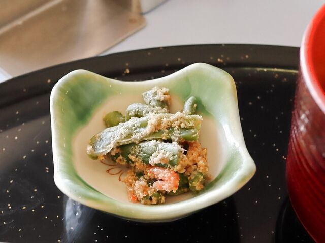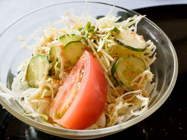 若鶏の唐揚げ定食をいただきました。定食の料理内容は、若鶏の唐揚げ、小鉢、ご飯、味噌汁、漬物でした。若鶏の唐揚げは、生ビールの美味しいつまみになりました。たれが用意されていましたが、野菜に添えられていたカットレモンと塩でいただきました。小鉢はいんげんの胡麻和えで、これも生ビールの美味しいつまみになりました。添え野菜は野菜補給に食べて、漬物は少し食べたご飯のお供にしました。