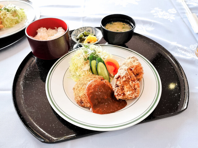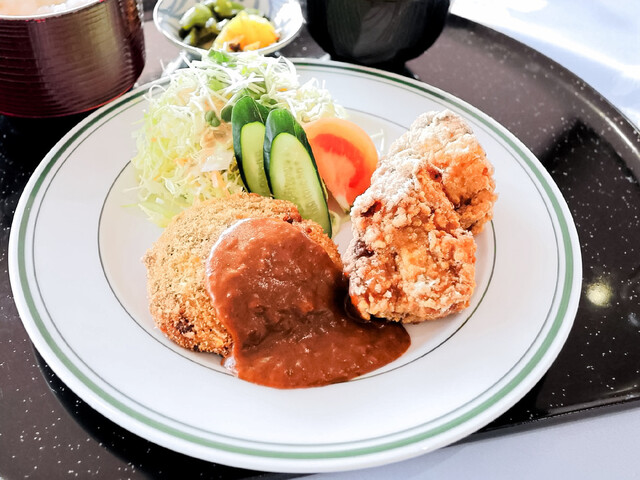 オリーブメンチカツ&鶏のから揚げ定食を選びました。