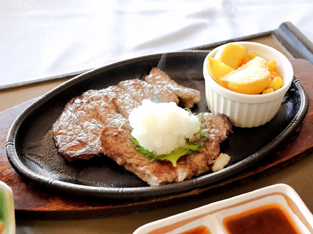 鉄板カットステーキを注文しました。ステーキ、小鉢、サラダ、ご飯、味噌汁、漬物がセットになった内容で、見た目はじゃこ天のようにも感じられる色合いと厚みが印象的でした。食感は柔らかすぎず硬すぎずでした。2種類のステーキだれで味変を感じながら生ビールのつまみとしていただきました。鉄皿にはステーキのみが盛られ、ポテト、コーン、人参のグラッセなどの付け合わせは別の小皿で提供されていました。小鉢のひじき煮と2種の漬物も生ビールのつまみにし、サラダは血糖値の上昇を抑えるべく食べ始めに半分程度を食べて、残りは食事中に野菜補給としていただきました。