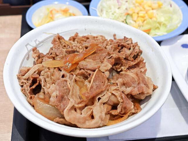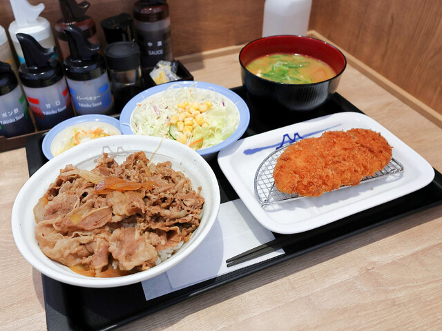 牛めしあたま大盛、豚汁、生野菜、お新香、単品ロースかつをいただきました。単品ロースかつは松のやのメニューです。松屋の牛丼は牛めし表記です。そうした理由があるのだと思いますが私は知りません。牛めしはあたま大盛にしました。最近吉野家でもあるあたま大盛は有難いメニュー構成だと思います。程好い甘辛さの牛肉が美味しいと思いましたがご飯が今一でした。豚汁は具沢山でしたが豆腐の量が多かったです。生野菜…サラダでいいと思いますが生野菜とした理由があるのだと思います。卓上にあるドレッシングをかけていただきました。お新香は白菜で普通に美味しく、単品ロースかつはさくッと揚がっていて牛めしのおかずにしていただきました。
