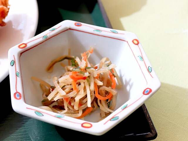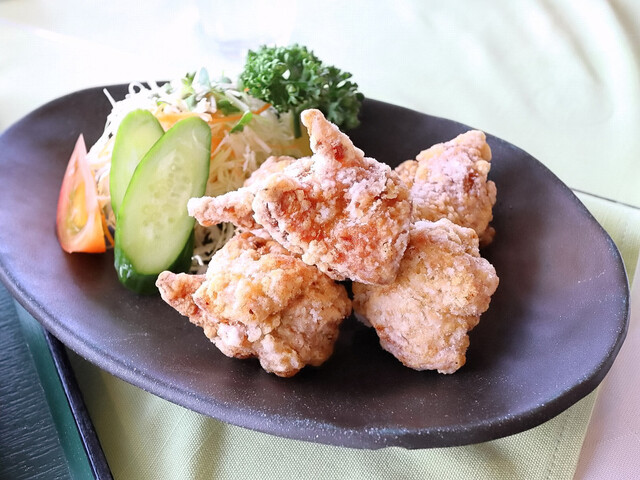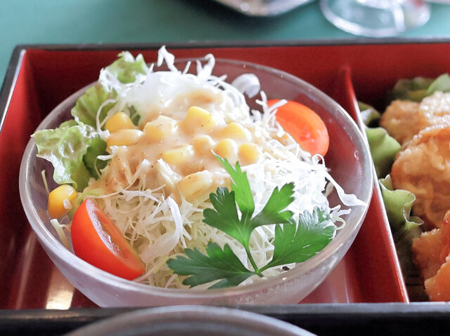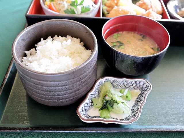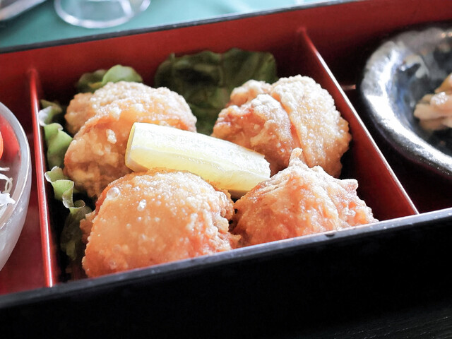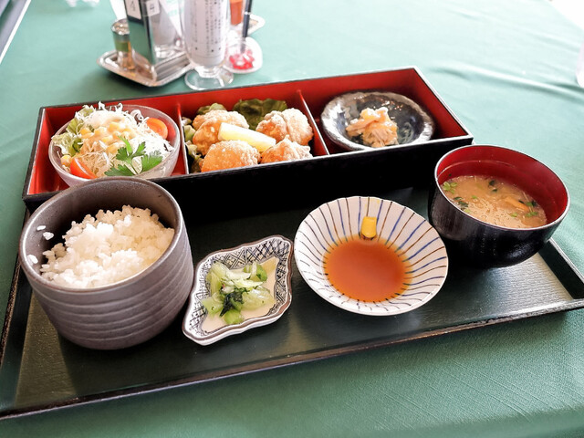 若鶏竜田揚げ御膳をいただきました。仕切りのある弁当箱に、竜田揚げ、サラダ、小鉢が並び、ご飯、味噌汁、漬物が付いた内容です。竜田揚げは団子状の鶏唐揚げで、竜田揚げ特有の風味はあまり感じられませんでしたが、生ビールとの相性は良かったです。
