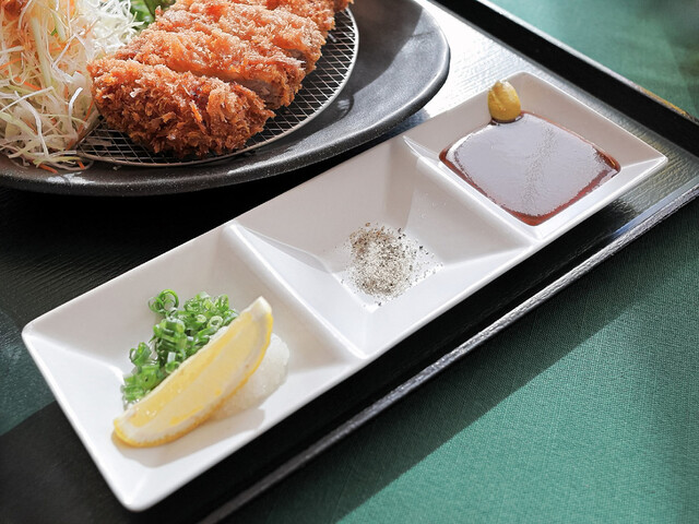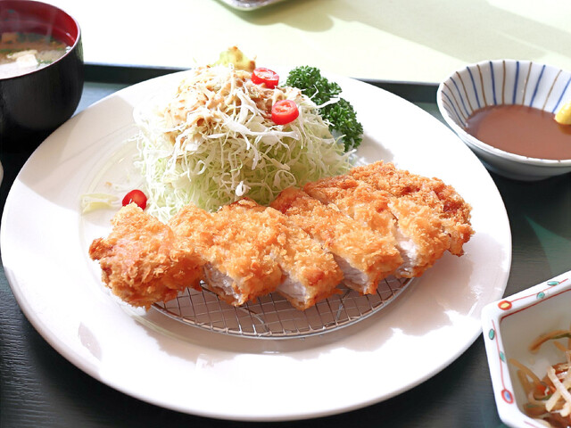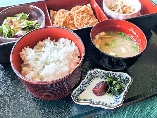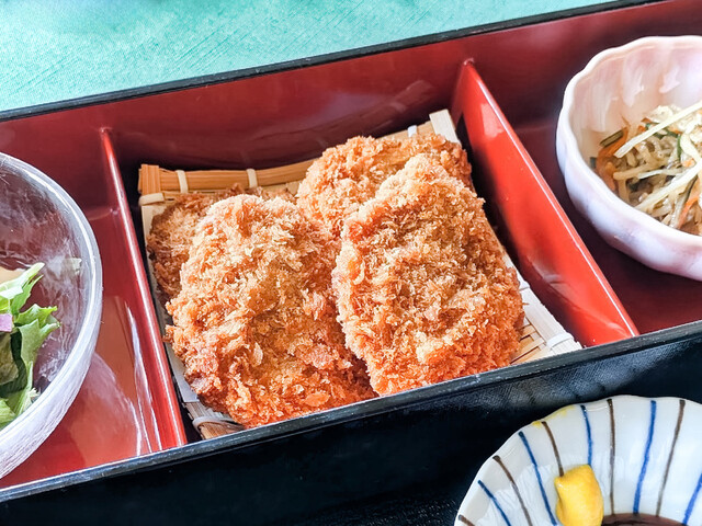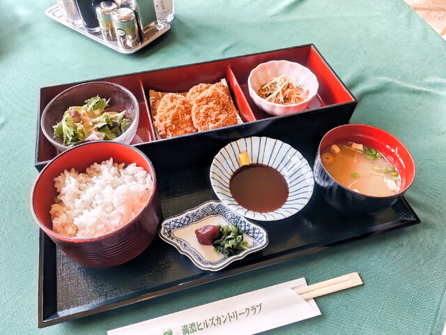 満濃特有の三連箱に料理が並んでいて、内容はヒレカツ、サラダ、小鉢、ご飯、味噌汁、漬物でした。盛り付けはサラダの量が少なく感じましたが、ヒレカツは普通に美味しかったです。