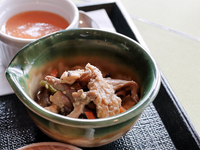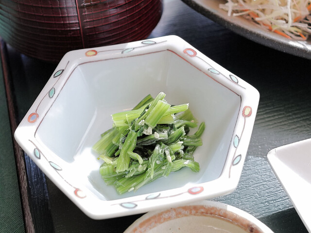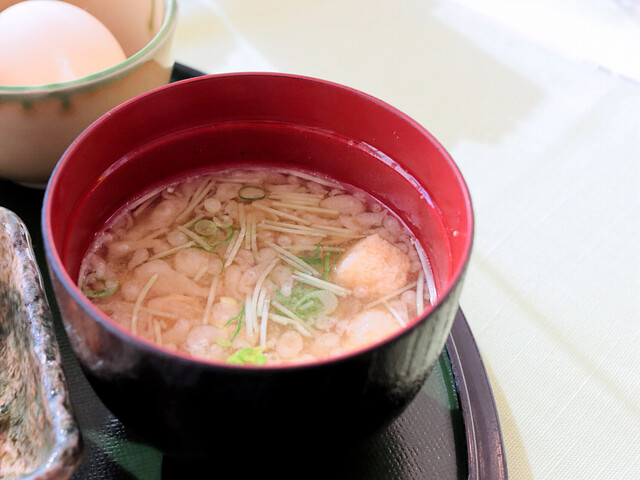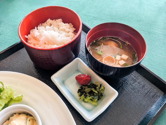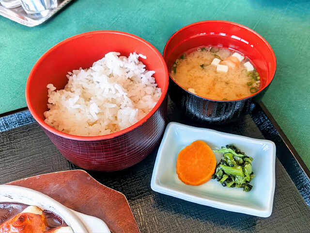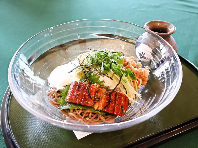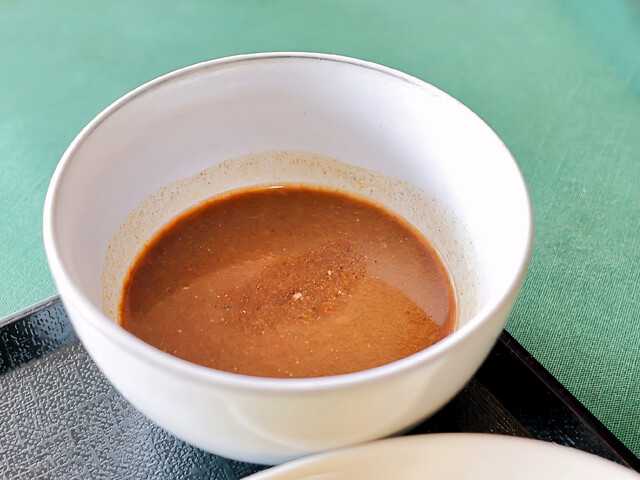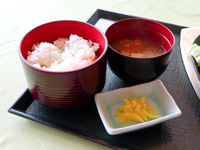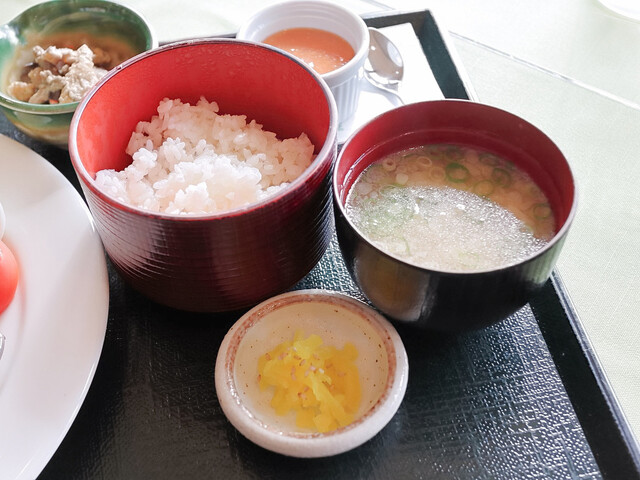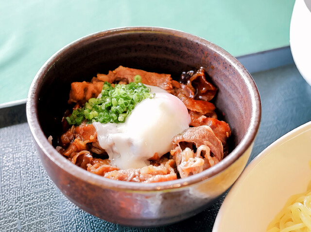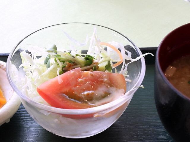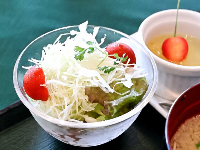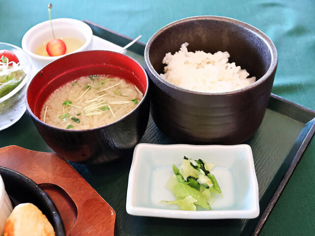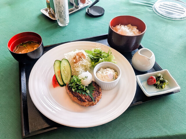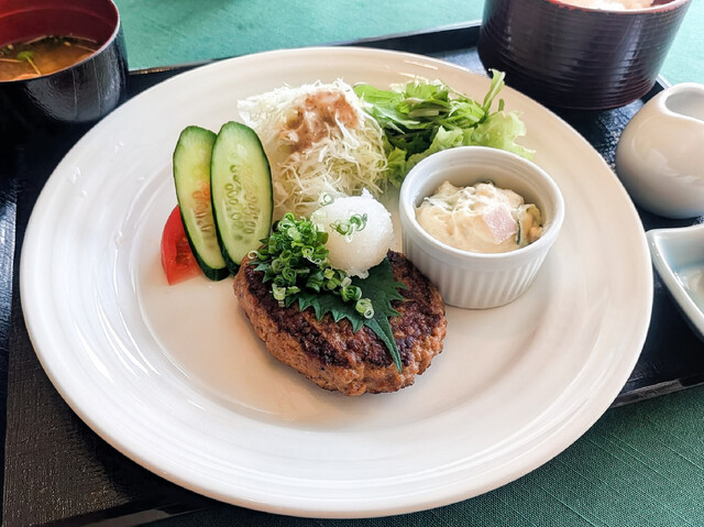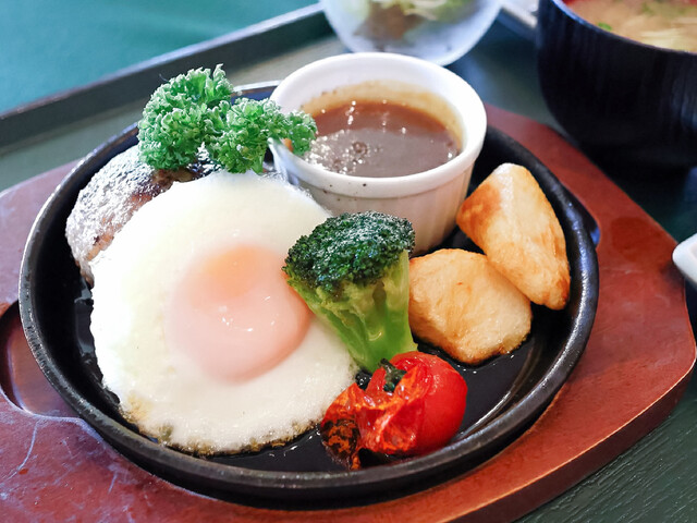 相方はスタミナ蕎麦を選びました。牛肉旨煮、鰻の蒲焼、山芋とろろ、納豆、温泉卵、かいわれ大根が盛り付けられた、まさにスタミナがつきそうな一品でした。見た目も美味しそうで、相方も「美味しい」と言っていました。私は手ごねビーフハンバーグを注文しました。ハンバーグにはうどん県香川のブランド牛であるオリーブ牛が使われており、焼き加減も食感も良く、とても美味しかったです。和風オニオンソースの味も絶妙で、ビーフハンバーグの美味しさを引き立てていました。ハンバーグと目玉焼きの組み合わせは好きな組み合わせです。添えられた目玉焼きは、名わき役としてその魅力を存分に発揮していました。添え野菜はプチトマト、ブロッコリー、ポテトで、どれも美味しかったです。サラダは野菜補給と血糖値の上昇を抑えるためにいただきました。ご飯は美味しく炊けていて、味噌汁もいつものように美味しく仕上がっていました。好きなタイプの漬物は良い箸休めになりました。デザートは相方に食べてもらいました。