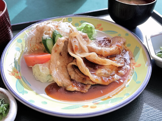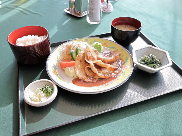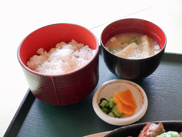オリーブ豚生姜焼き、小鉢、ご飯、味噌汁、漬物