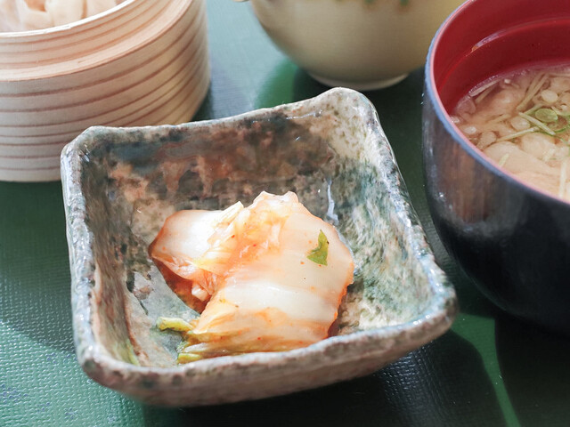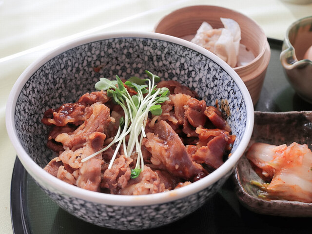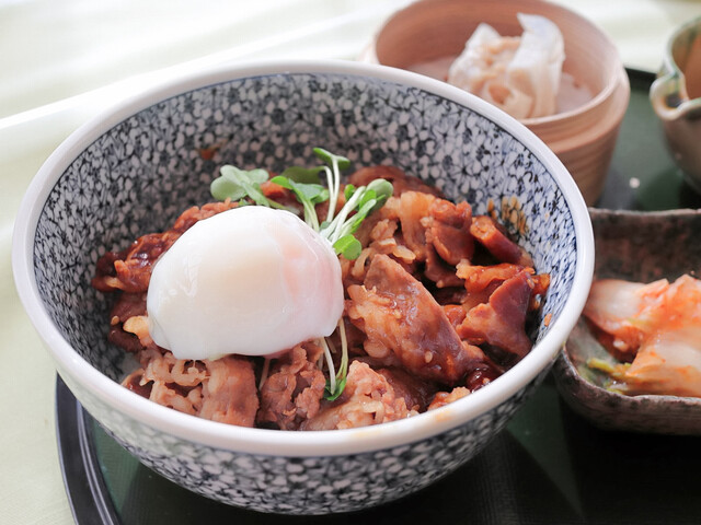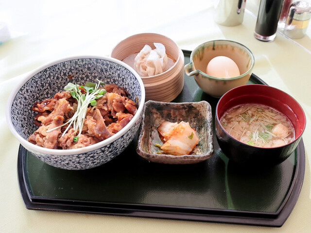 牛カルビ焼肉丼、焼売、キムチ、温玉、味噌汁