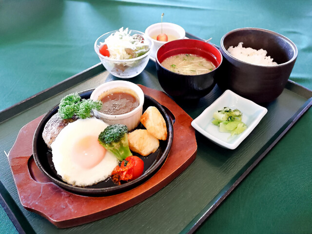 手ごねビーフハンバーグ、サラダ、ご飯、味噌汁、漬物、デザート