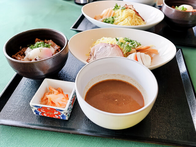 内容はラーメン・スープ・カルビ丼・キムチで、ラーメンの麺は卵麺で、焼豚・ゆで卵・メンマ・水菜・ねぎが添えられていました。程好いコシのある麺とスープの相性が良く、スープは魚介鶏豚骨だそうで、3種がうまく融合していて、卵麺の風味も加わり好みの味に感じました。焼豚やゆで卵などは名わき役のような存在でした。カルビ丼も美味しくいただくことができ、カルビ肉の味付けが良く、温玉を混ぜても美味しかったです。キムチは良い箸休めになりました。