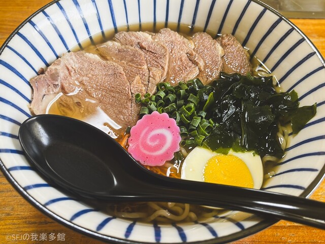 具材はチャーシュー、玉子、ワカメ、人参、ネギ、ナルト。