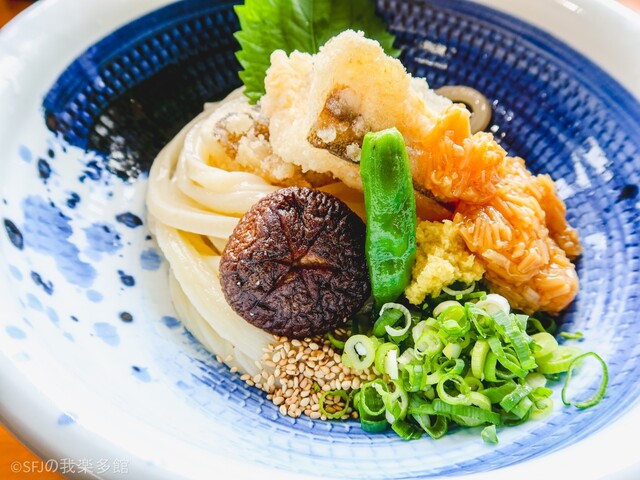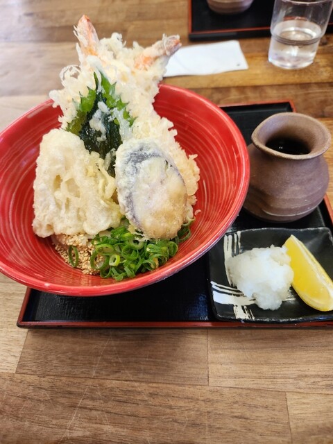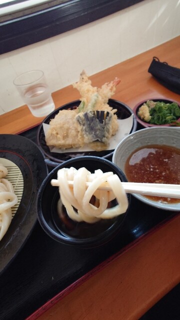 通り道で見かけたお店。麺のコシがすごく強い。温かさも3段階で選べるけど、暑い日だったので冷たいで。一段とコシを感じました。とり天も美味しかった。何故か千切りキャベツがあったけど、これはない方がいいかな...