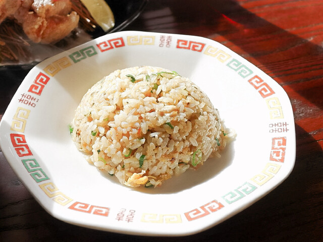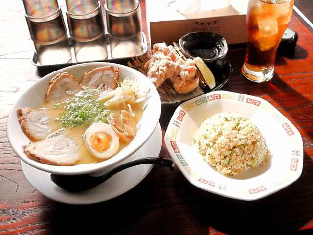 鶏系だと思いますが、とても美味しいスープでした。こくまろとは上手く言ったもので、確かにコクとまろやかさを感じる美味しい味でした。麺は中細ストレート麺の類になると思います。スープに合う茹で加減だと感じました。盛り付けはチャーシュー、メンマ、もやし、ゆで卵、青ねぎで、チャーシューがとても美味しかったです。焼き飯ハーフは炒め加減が私には丁度良く、美味しい味に仕上がっていました。こくまろスープを汁代わりにして美味しくいただきました。唐揚げは美味しさを感じるさくッとした揚げ加減で、焼き飯の美味しいおかずになりました。