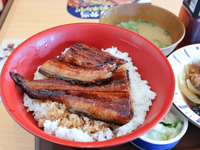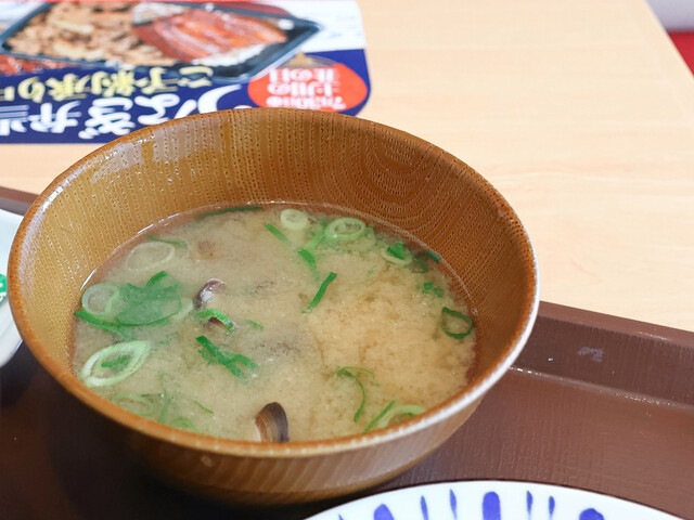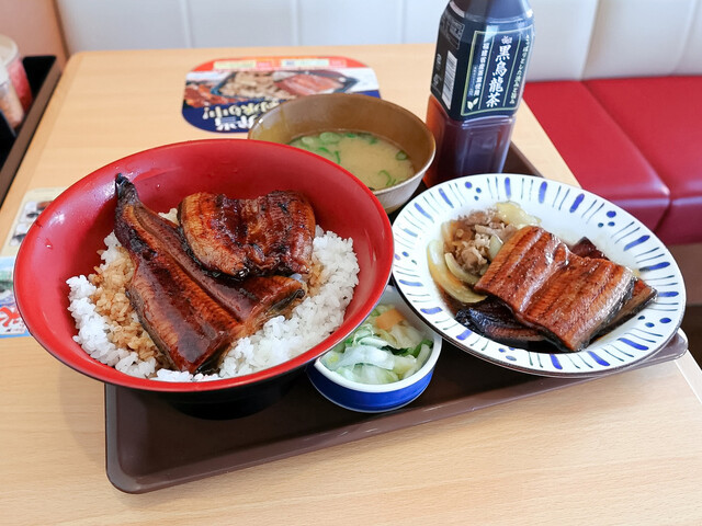 特うな丼+しじみ汁おしんこセット、特うな牛皿をいただきました。特うな丼には鰻が2枚盛られていて、そこに特うな牛皿の鰻2枚を追加して、特うな2尾丼にしていただきました。厚みが丁度良い鰻で、たれの甘さ加減も良くご飯がすすむ君でした。うな牛皿のすき牛は中盤にうな丼へ投入していただきました。このての多店舗化をしているお店で好きな食べ方の一つに鰻のたれを牛肉を絡めて食べる食べ方があります。今回もすき牛をそうして食べて満足できました。玉ねぎが多かったのも良かったです。うな丼を食べる時の汁ものは吸い物の方が好ましく思いますが、しじみ汁のしじみ風味が意外にうな丼にあっていて美味しかったです。すき家のおしんこは量が多いので、量の配分を考えることなく良い箸休めになりました。