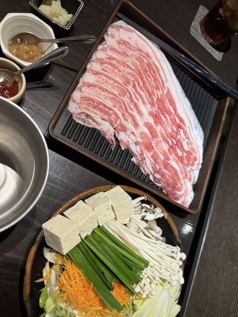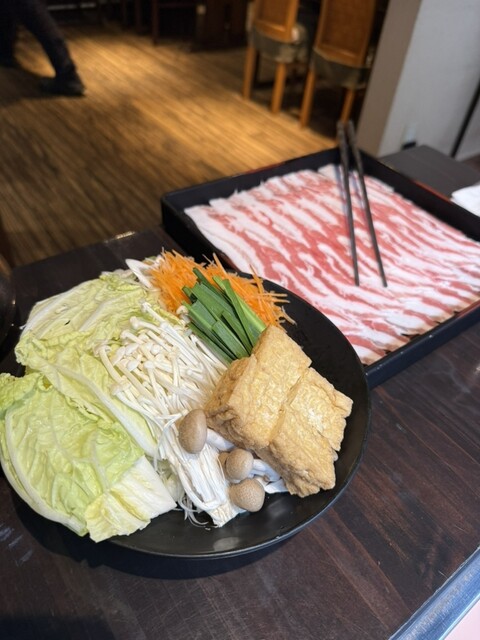 こちらは黒豚しゃぶしゃぶがメインで2名からの注文。2つの味が選べるという仕組みで3名で行きましたが、2名分にして、他にさつま揚げの盛り...