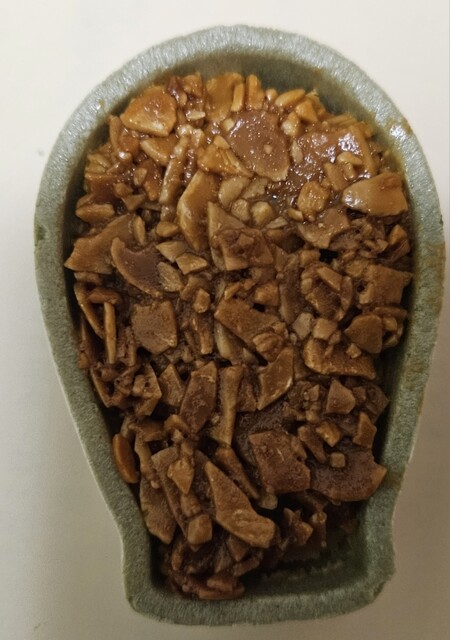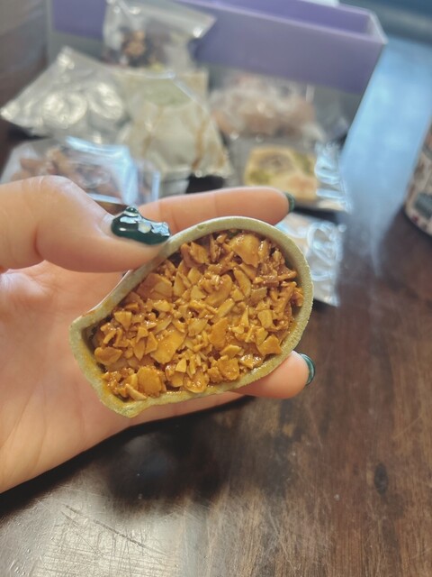 その名のとおりフクロウの形をしたフロランタンで、ヨモギ風味の最中皮に芋飴でキャラメリゼしたアーモンドとバターサブレを詰めた和風フロランタンです。