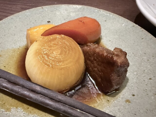 看板メニューの『肉じゃが』は、シチューのような濃厚さとごろごろの食感が焼酎のつまみにぴったりです...。