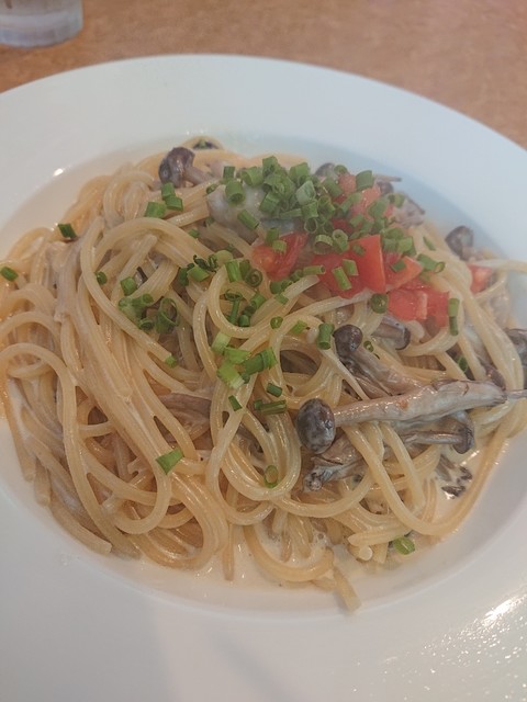小海老とキノコのバジリコを食べて美味しいけど私には塩味が少し足りなかったのでテーブルにある岩塩を追加したら好みの味に