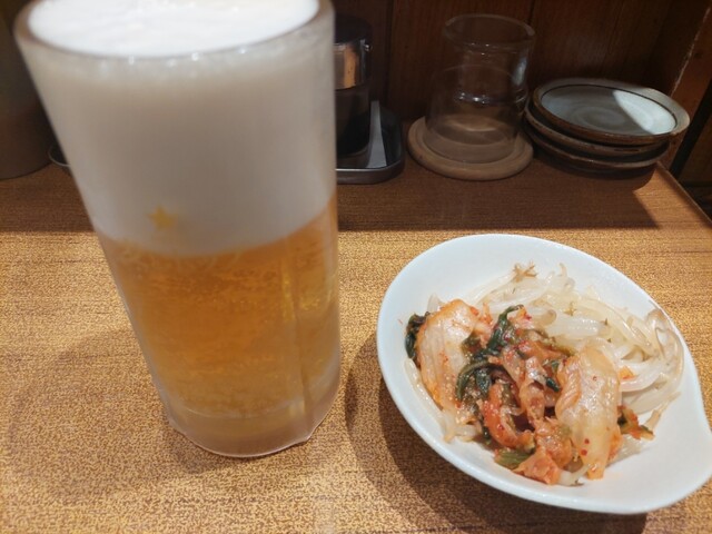 最初に生ビールとナムルが提供されました。キムチともやしを混ぜて頂くと白菜ともやしの歯応えが良くキムチの美味しさも手伝って危うく生ビールを飲み干すところでした。餃子が来る前にお店のオススメのブレ...