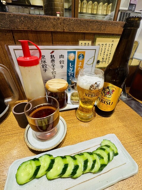 横浜駅地下街にある人気餃子店です。イートインスペースが少ないのでタイミングによっては並びますが回転が良いのであまり待たずに入店出来ました。まん天餃子、しそ餃子、キムチともやしのナムル、生ビールを注文。