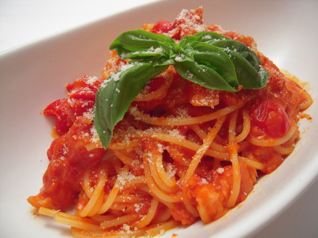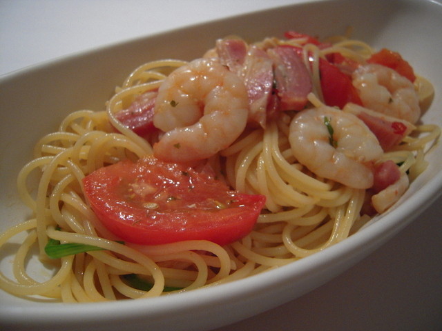 エビとベーコンとトマトのペペロンチーノ (by お店)