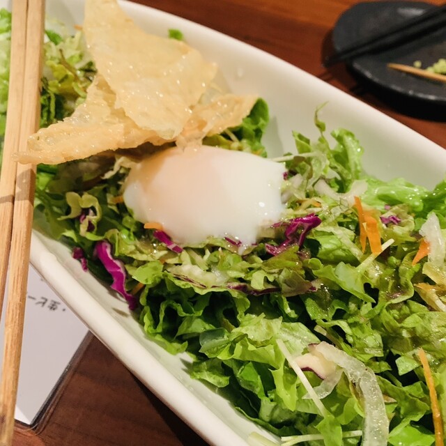 ・あげ湯葉と温泉卵のサラダ