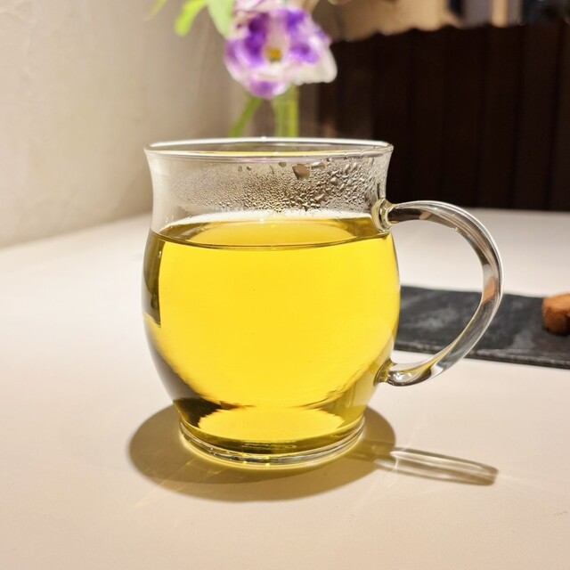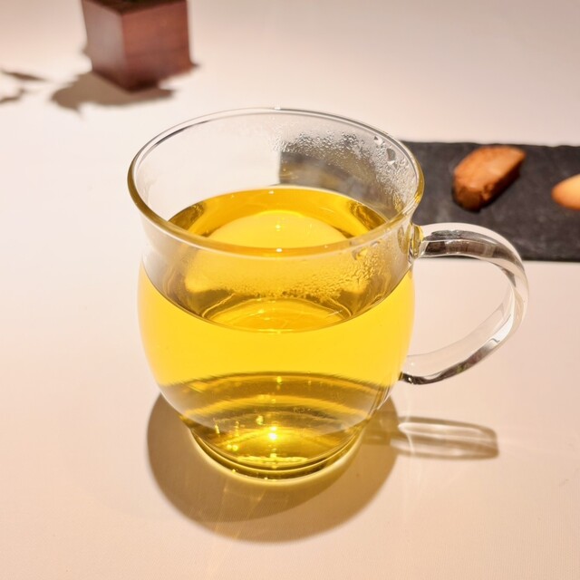 明るい黄色が特徴のお茶ですので、ガラスカップに入れての配膳は大正解ですね。