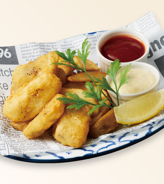名物のフィッシュ&チップス(1,200円)は肉厚で食べごたえ抜群、特製タルタルソースと相...