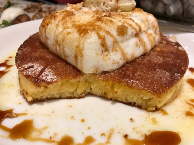 大皿にいっぱいに広がるびっくりサイズのパンケーキはふかふかの生地に濃厚なクリームやソースが相性抜群。 「アクイーユ」はフランス語でおもてなしを意味する店名の通り、こだわりのインテリアや専属パティシエが作る季節替わりのスイーツなど、ご満足いただけるような限定メニューをたくさんご用意しています。 パンケーキ以外にもゆったりカフェごはんとしてキッシュやエンチラーダグランタンもご好評いただいています!