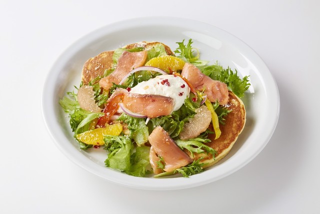 スモークサーモンパンケーキ~柑橘ドレッシングと濃縮ヨーグルト添え~
