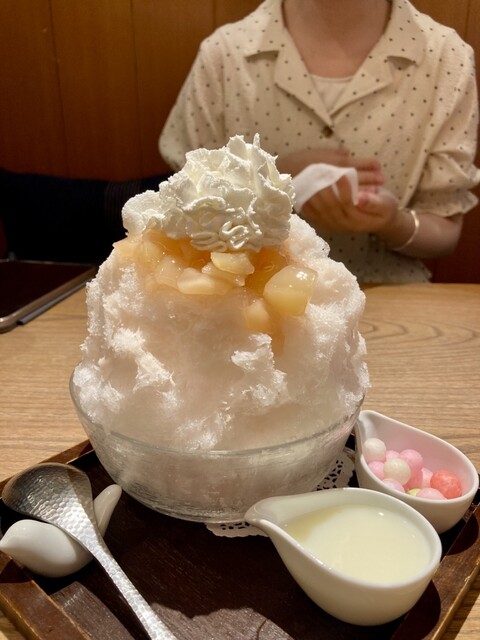 桃と信州高原みるく 1350円 天然水の削り氷に、信州産みるくソース入りの桃ソースをかけ、ゴロゴロ果肉の桃とホイップをのせて仕上げた。 一口食べてちょっと肩透かし。果肉はやや缶... 詳細を見る