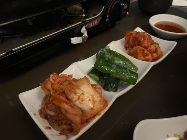 サムギョプサルに、サラダ、キムチ、日替りおかず(もやしナムルかな?)、ライス、スー