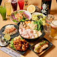 自家製「唐揚げ」「お刺身3種盛り」から、名物「鹿児島産 種鶏のタタキ一石二鳥盛り」まで味わえる充実した内容が魅力◎ メインの「鶏ガラ地鶏水炊き鍋」は、〆に雑炊をご用意いたしました。自慢の濃厚スープを最後までご堪能いただけます♪
