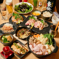 お酒に合う名物「鹿児島産 種鶏のタタキ一石二鳥盛り」や「お刺身2種盛り」も楽しめる満足プラン♪ メインには濃厚スープが決め手の「鶏ガラ地鶏水炊き鍋」をご堪能いただけます◎ 多彩なドリンクを堪能できる飲み放題付きのため、各種宴会にも最適です!