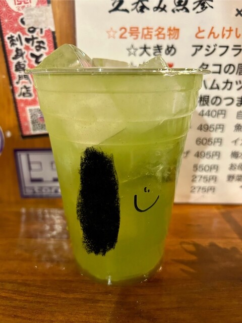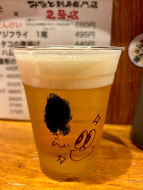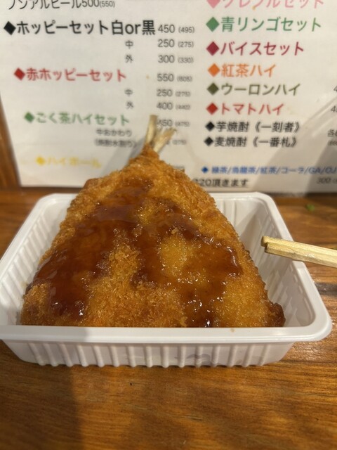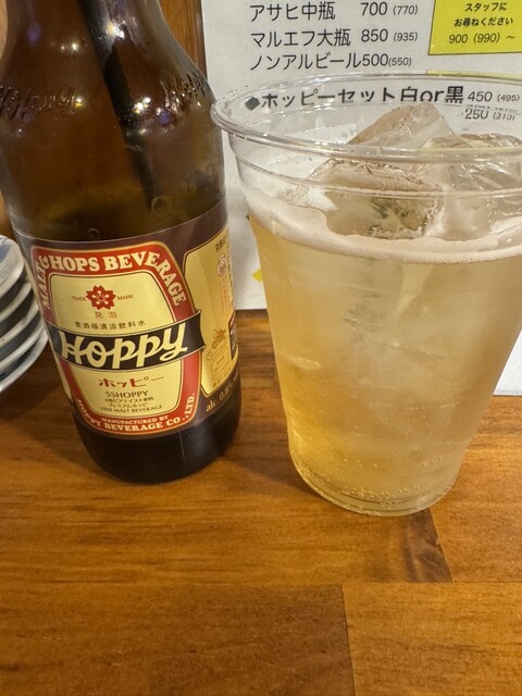 1回の立ち飲み席で1人なのでカウンターに案内され、いきなり名前かニックネームを聞かれるシステム。個人的にはあまりいい気はしない。立て続けに飲み物を聞かれ、ホッピー白をオーダー。