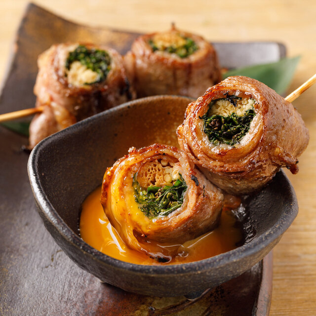 地鶏の串焼きと旬のお野菜を使用した野菜串巻きは旨味たっぷりの自身の逸品です。