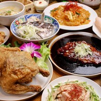 2つのメイン、自家製唐揚げの油淋鶏と黒酢豚ステーキを楽しめる、鬼貝宴会定番コース。 生ビール、焼酎が付いたスタンダード飲放題プラン。