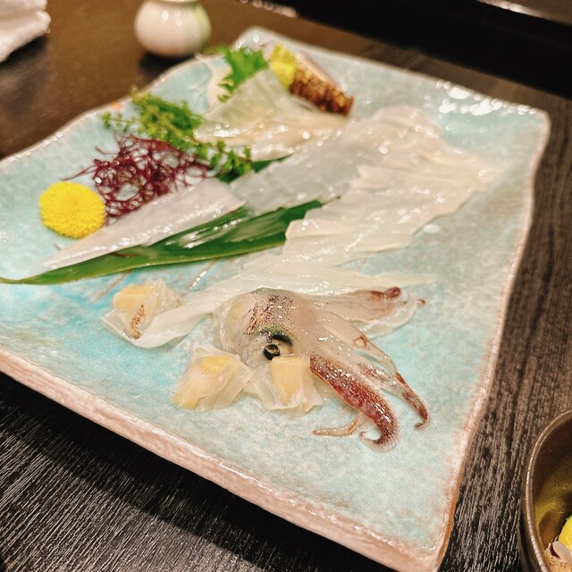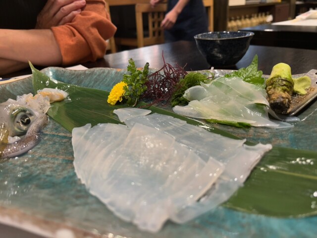 どうぞ、新鮮なイカ刺、かわはぎのキモあえなど