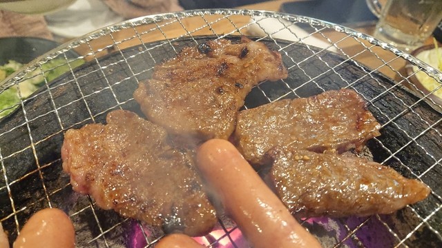 つまみに丁度良い焼肉を網で焼いて