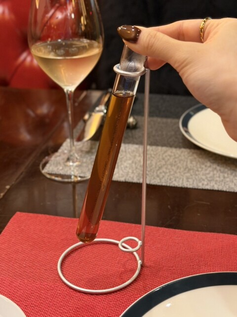 まずはジビエのコンソメスープが試験管に入って登場。