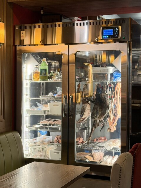 シェフ自ら狩猟に行くそうで、店内の熟成庫の中には仕留めた野鳥が吊るされています。