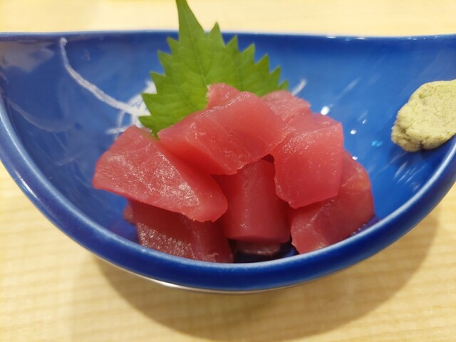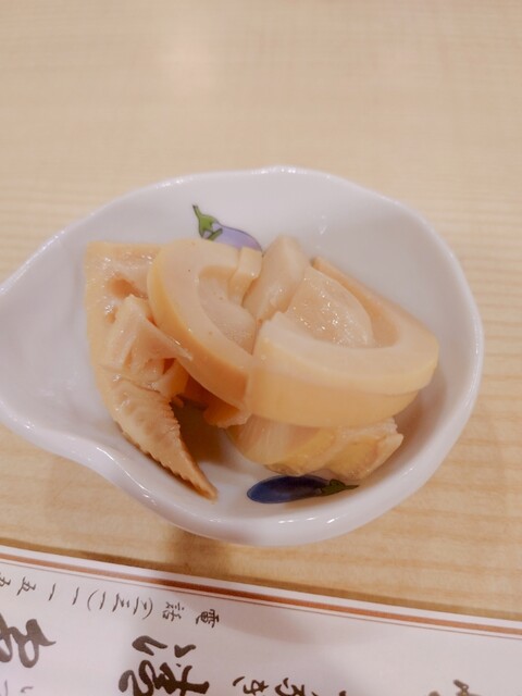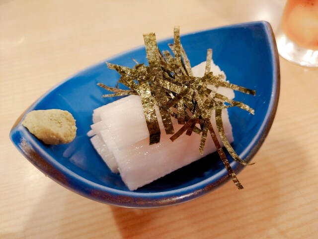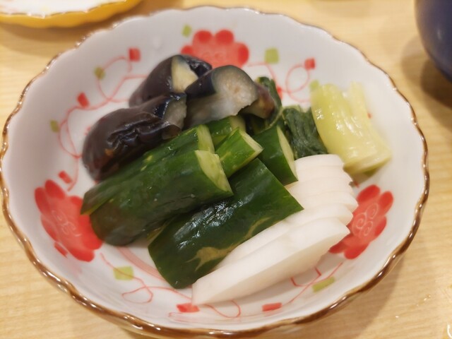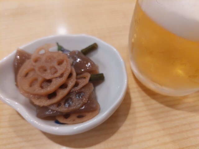 お通しの蓮根のきんぴらですかね?これが美味しくて良いつまみだなと思いました。マグロのブツは赤身でお新香は自家製の糠漬けで酸味が少なくて塩梅が良いので個人的には結構好きです。...