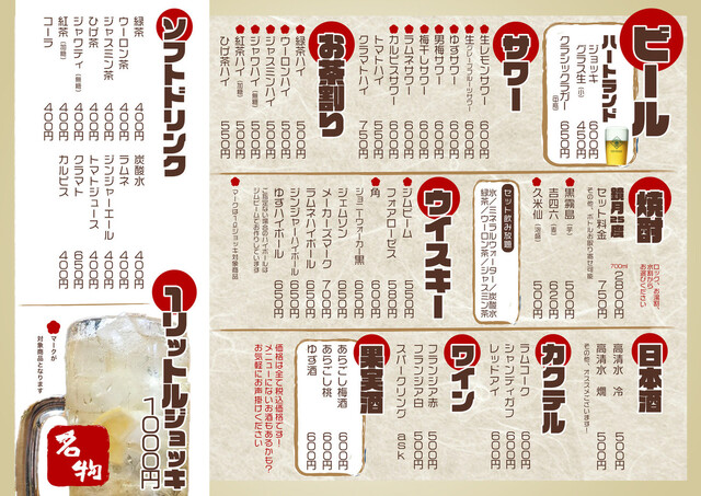 | ドリンク | 日本酒あり、焼酎あり、ワインあり、カクテルあり |